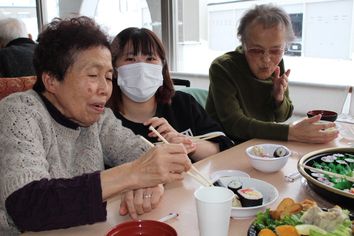 利用者様からは「みんなで食べると楽しいね。巻き寿司美味しいわ。マグロも美味しい。お代わりしていいですか。」皆様普段よりも多く召し上がっておりました。