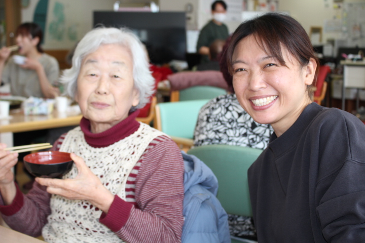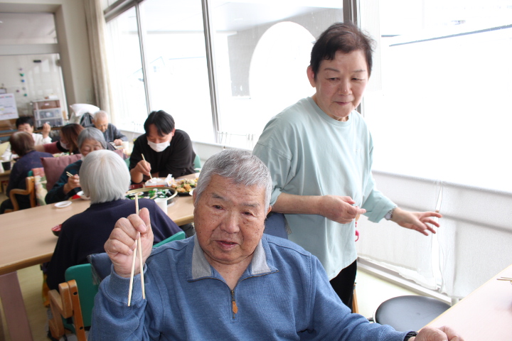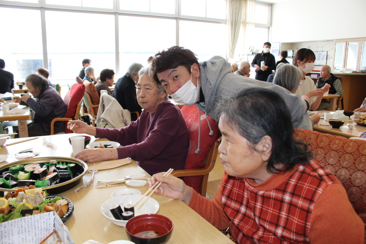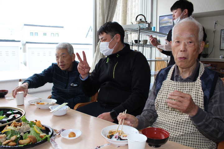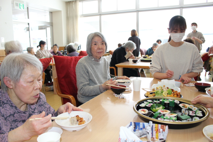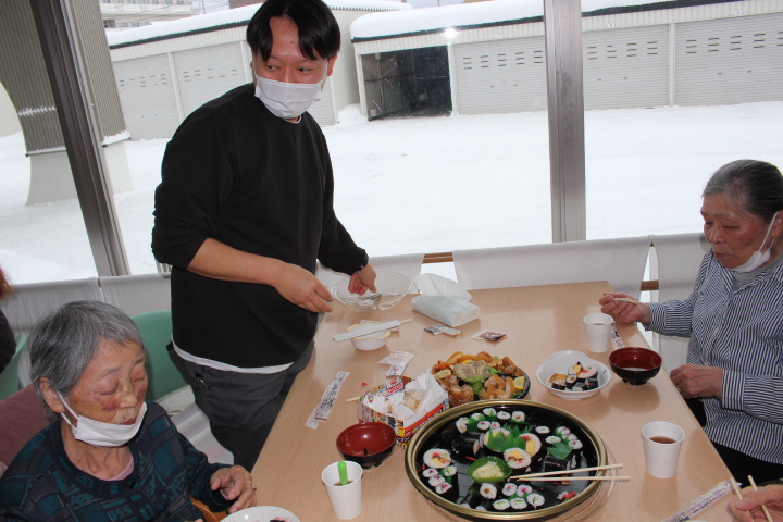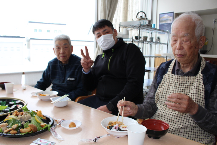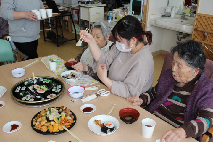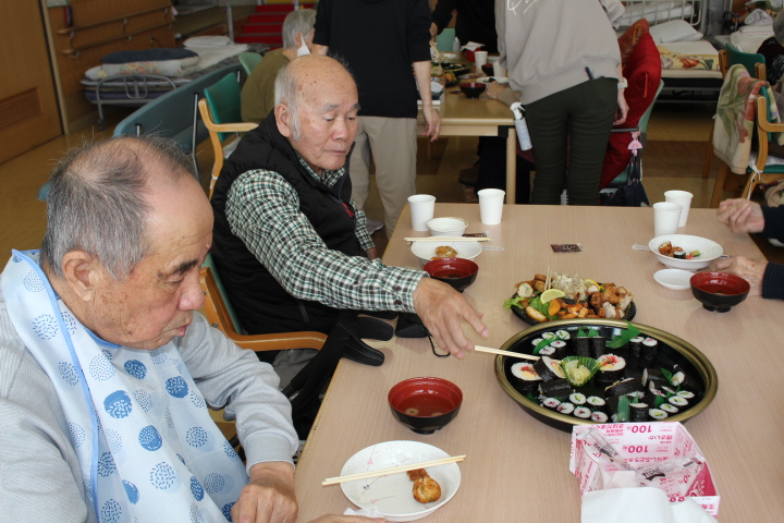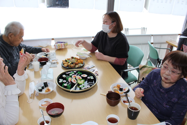 利用者様からは「みんなで食べると楽しいね。巻き寿司美味しいわ。マグロも美味しい。お代わりしていいですか。」皆様普段よりも多く召し上がっておりました。