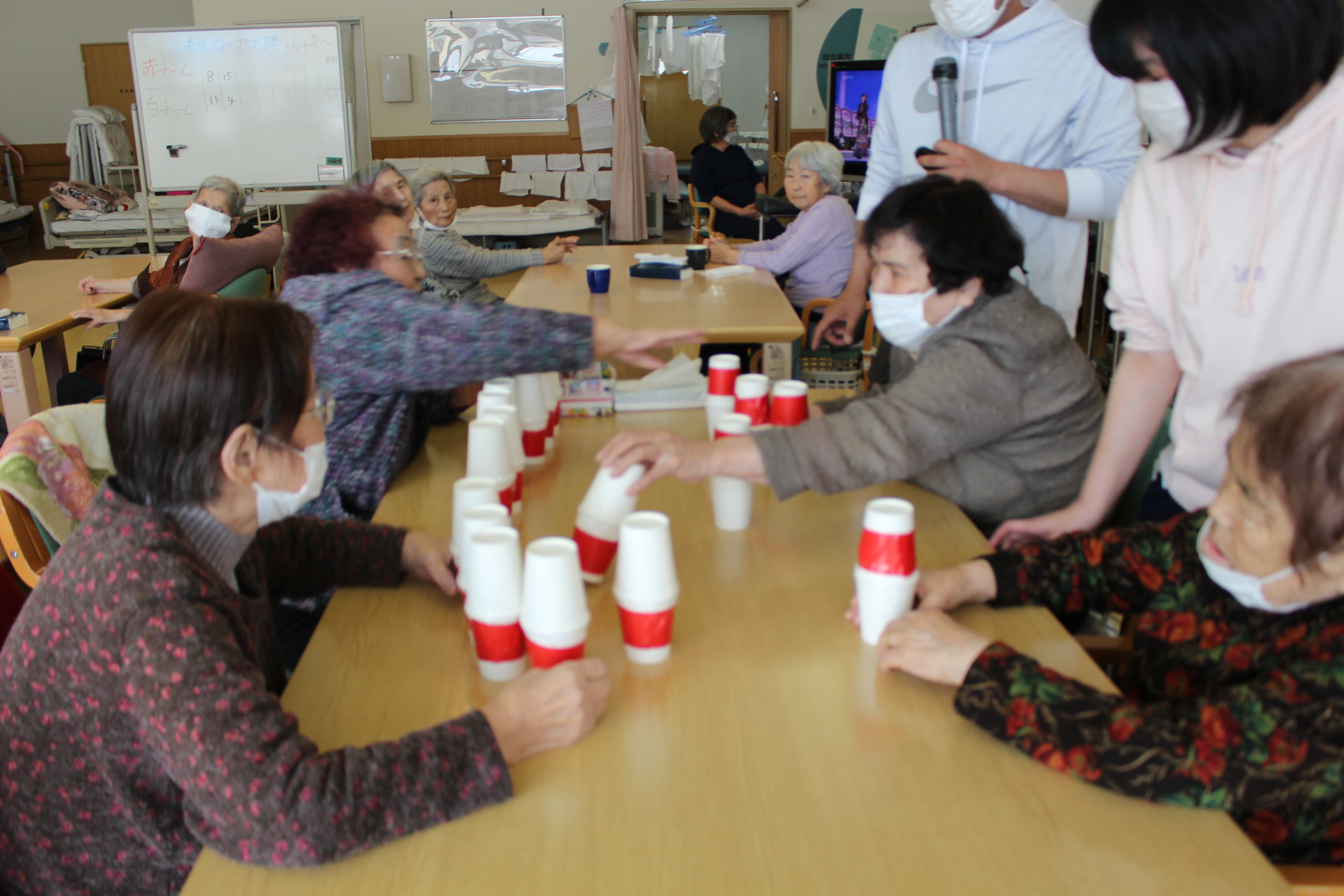 紅白になっている紙コップ赤チーム・白チームに分かれて 、制限時間内にどれだけ敵陣から取って白に変えるか、赤に変えるか勝負の分かれ目です(^^)