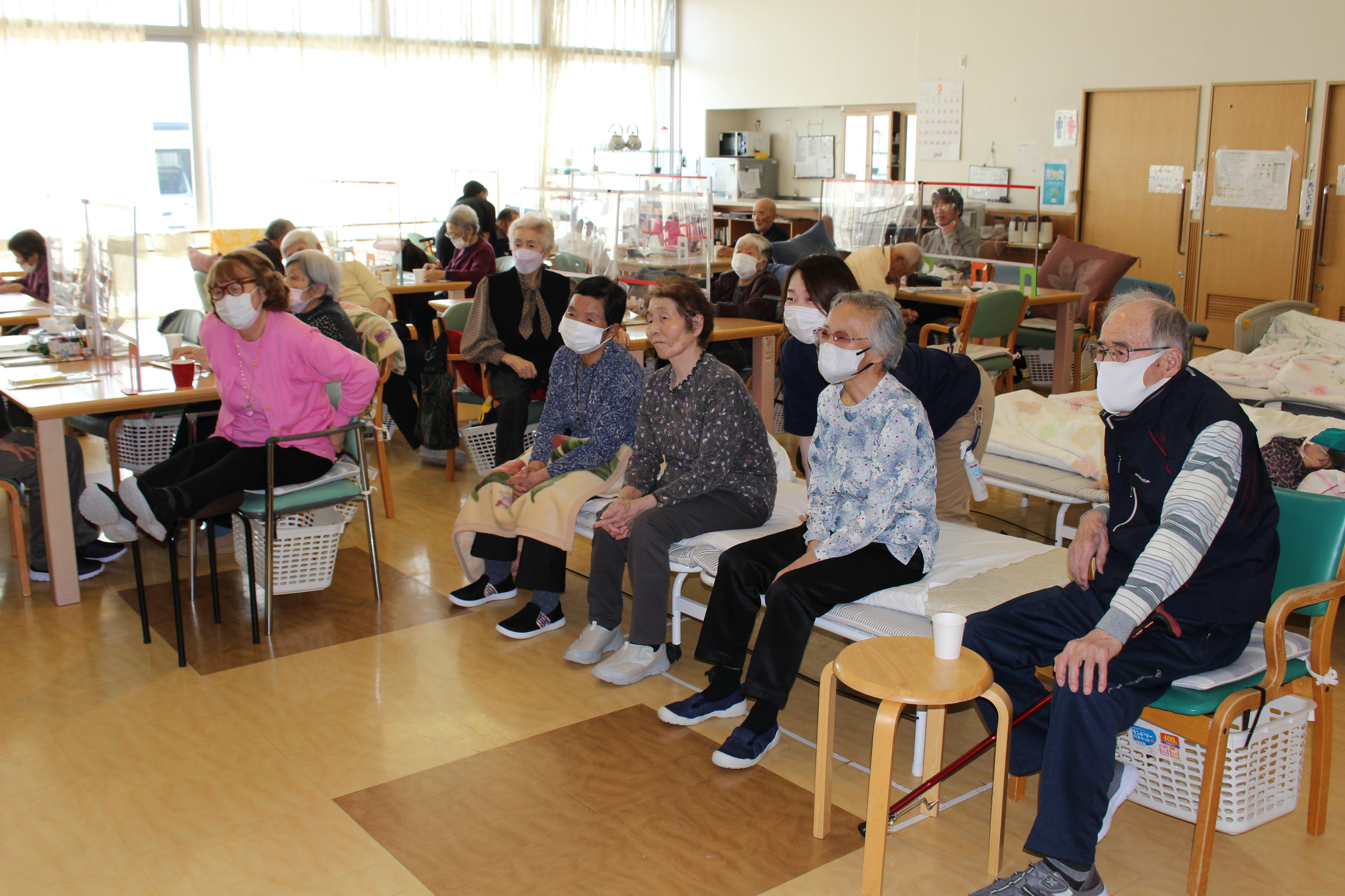 デイサービスかみんでは男性よりも女性の方が野球が好きな方が多いようで、朝からテレビの前に釘付け。写真は職員1名がサボっているように見えますが、目の見えない方に実況しているのでちゃんと仕事をしていますよpaper.gif