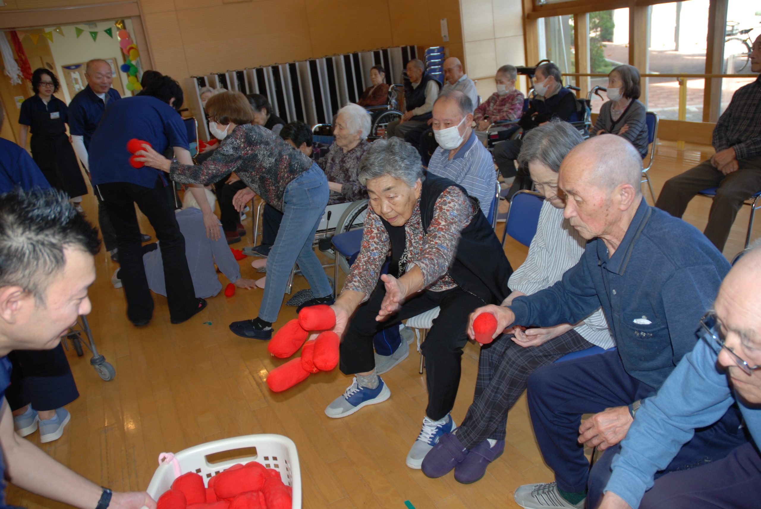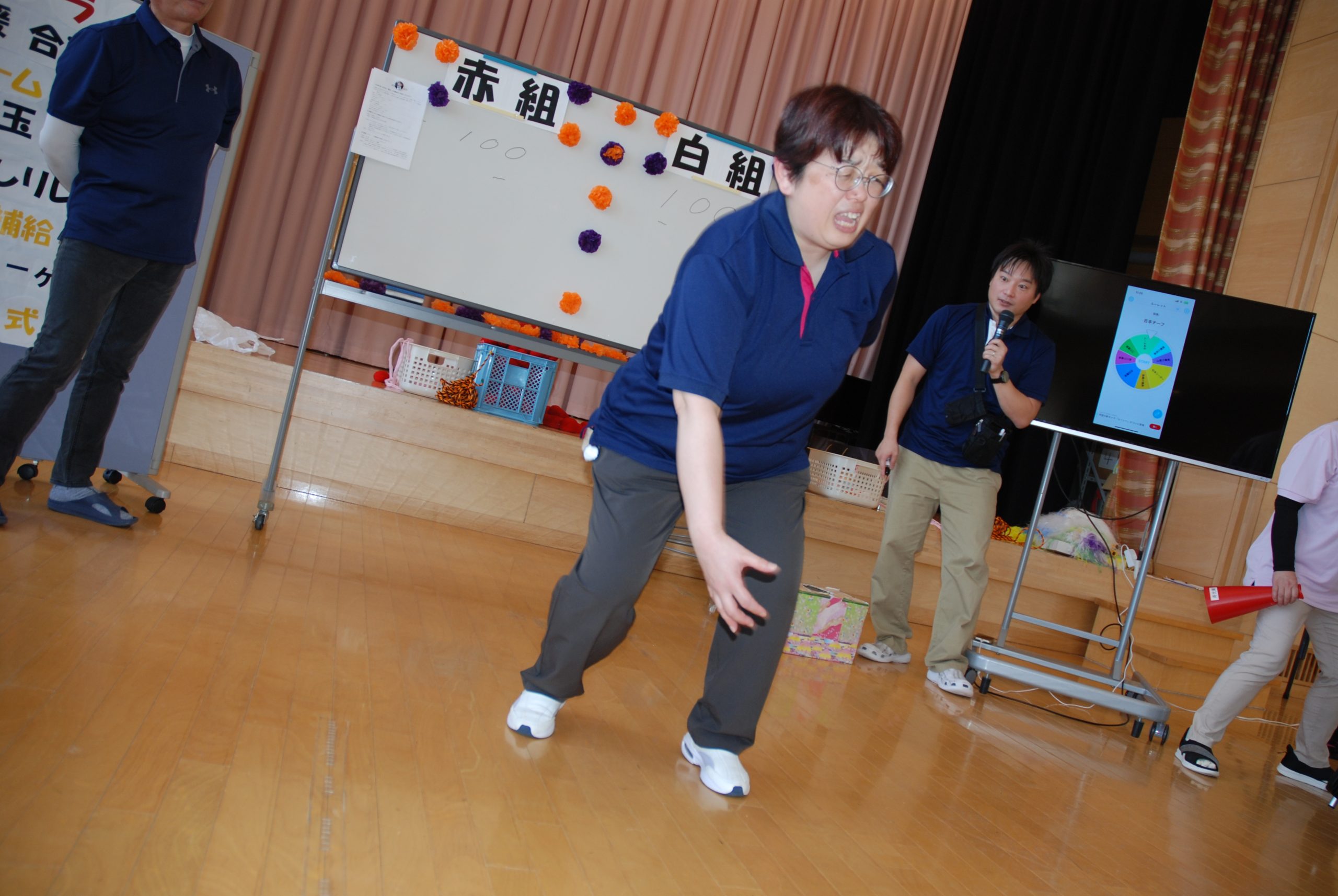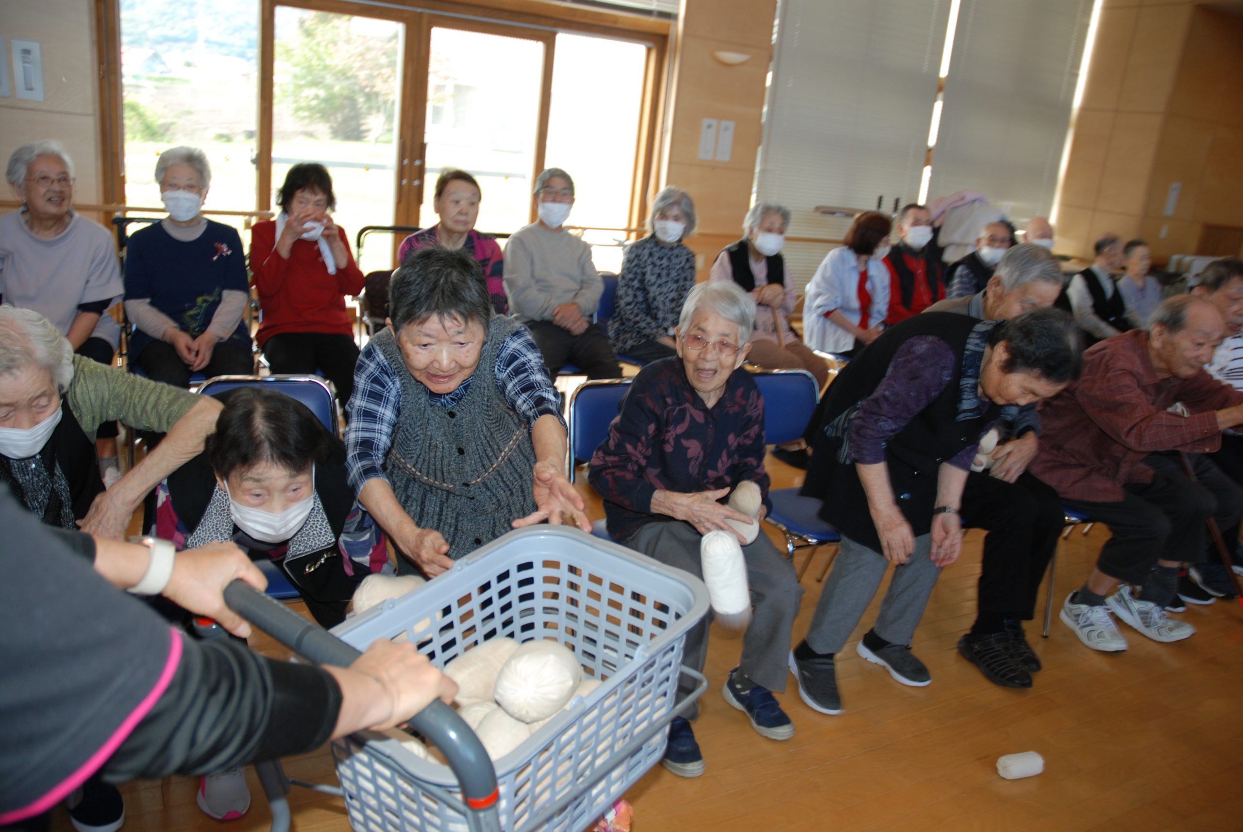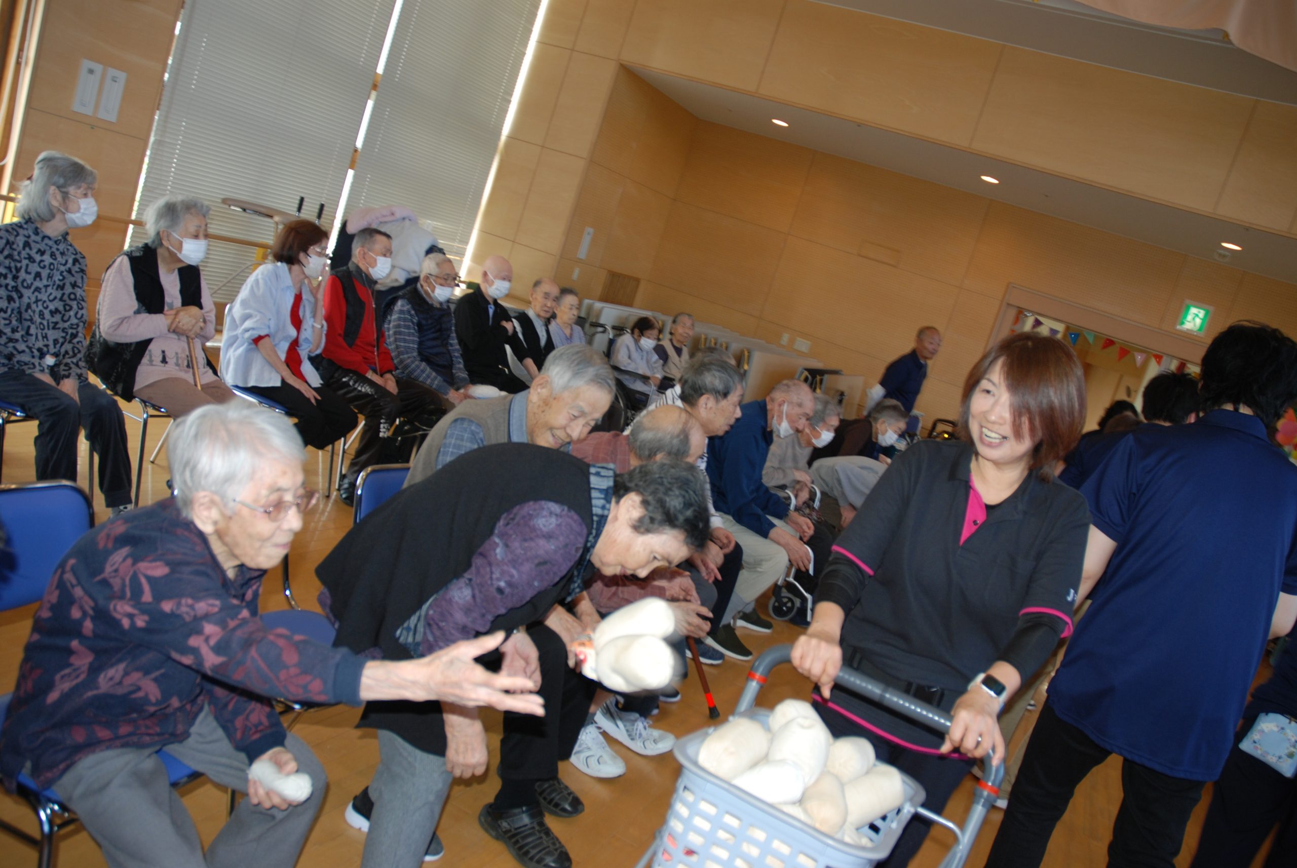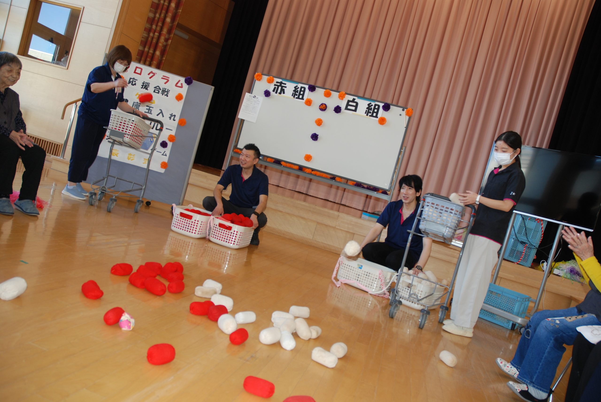 カゴが移動するので皆さんは座ったままでの玉入れです・・が、思わず立ってしまう方もいらっしゃいました(^^)