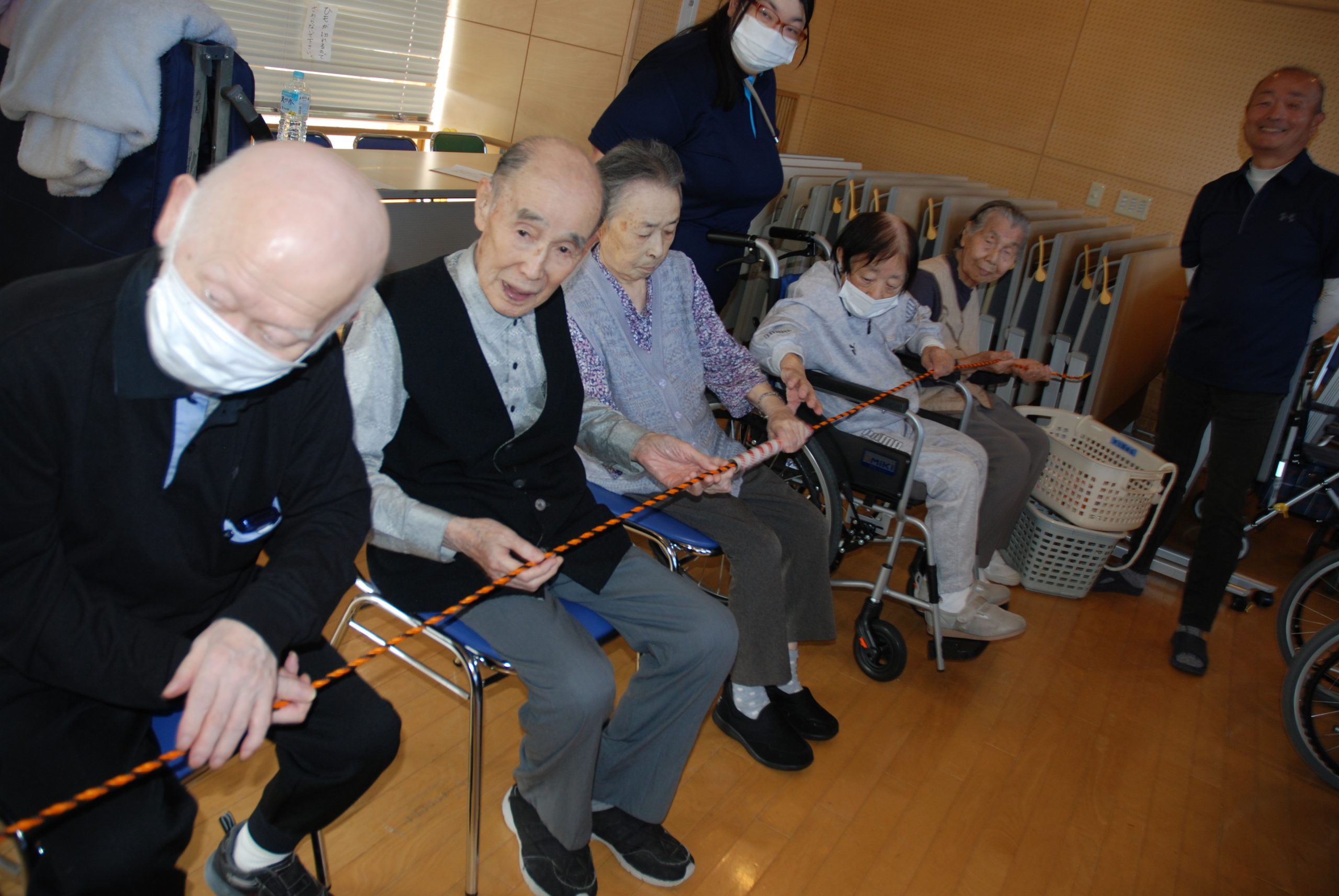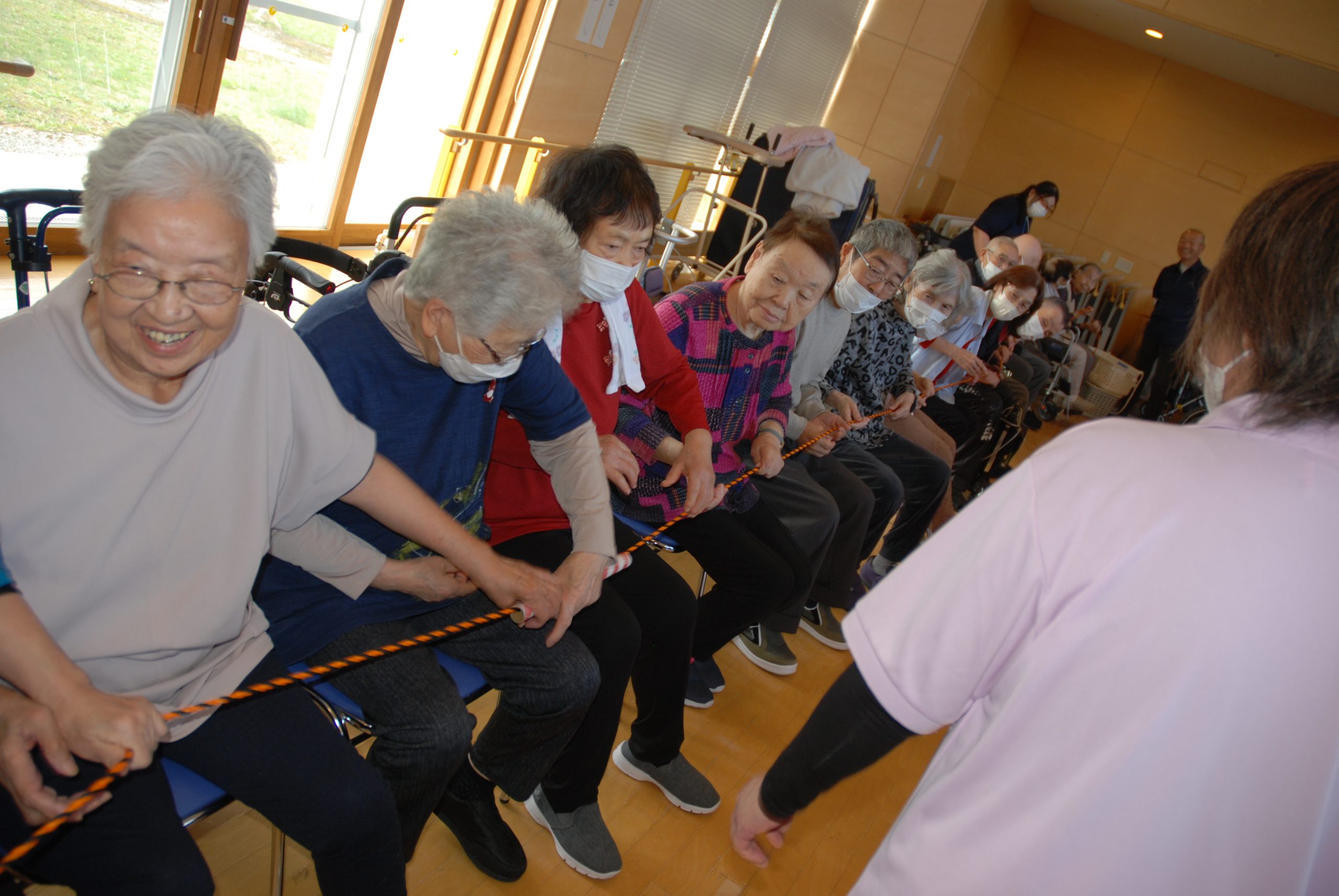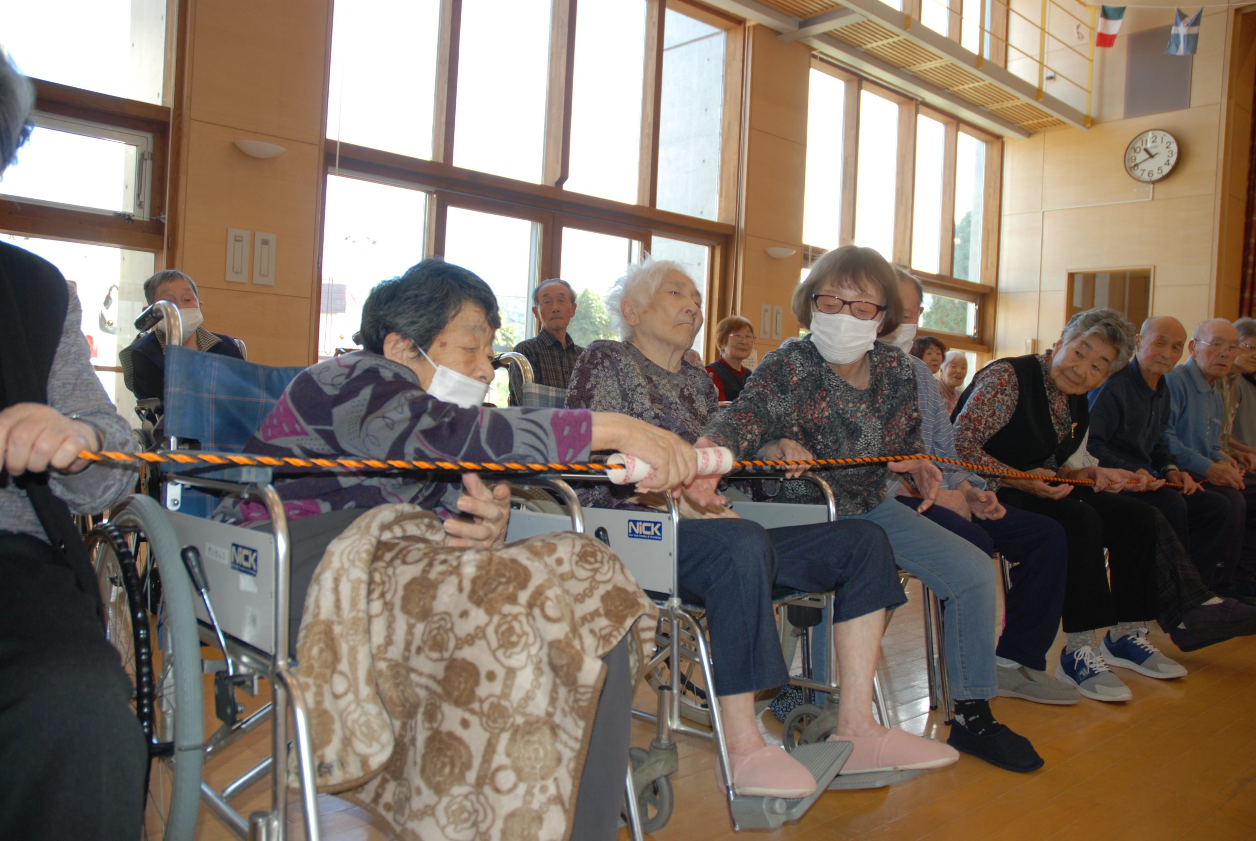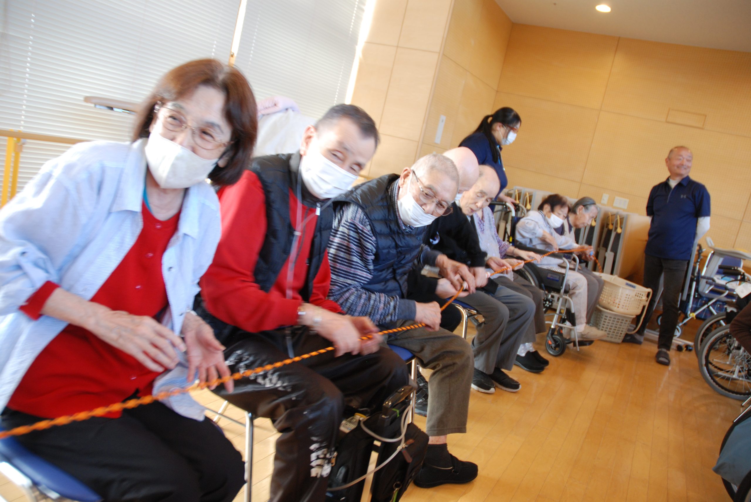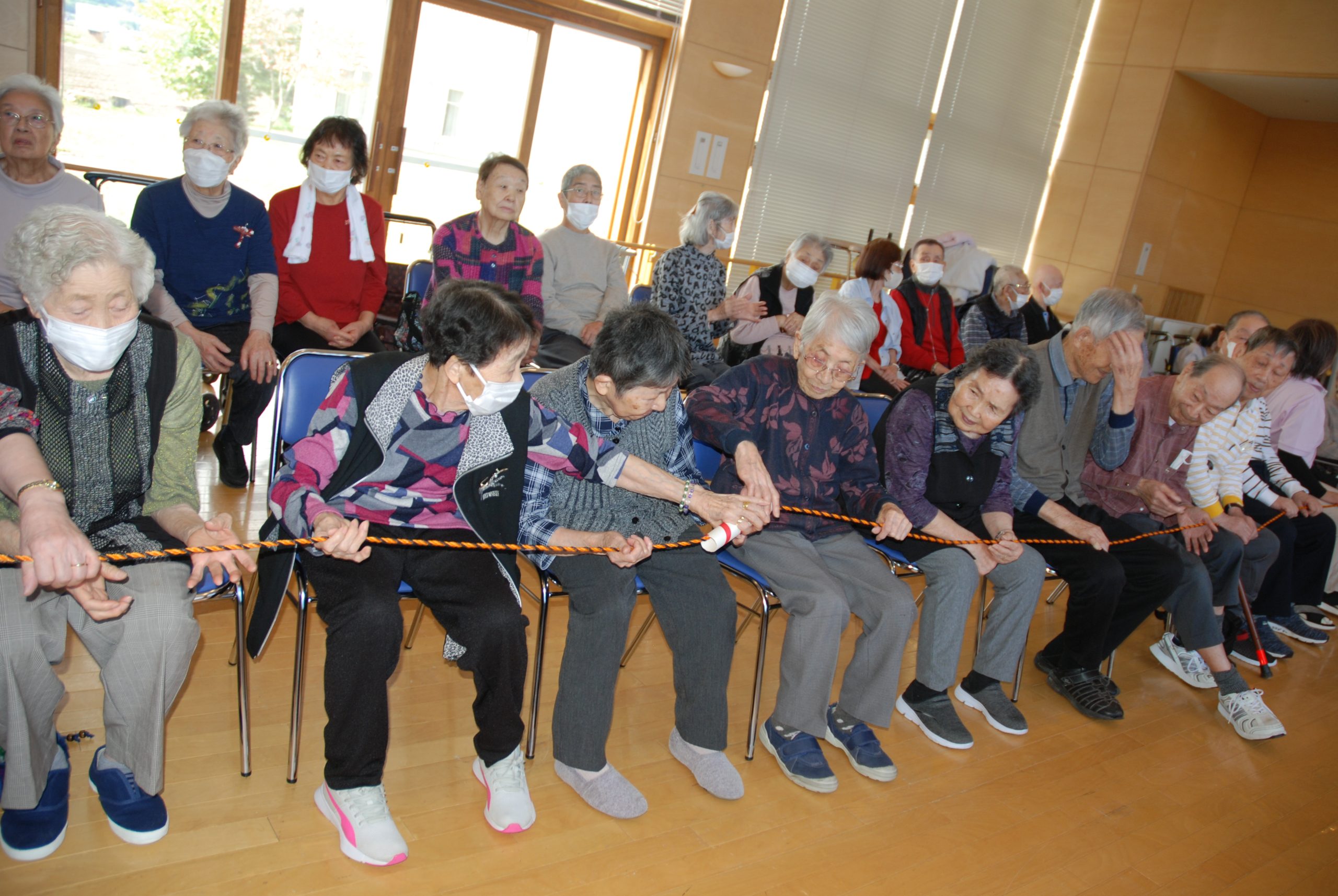 こちらも座ったままでの競技です。皆さんに1本の長い紐を持っていただき赤組白組とも同じ数の筒を隣へ隣へと渡しゴールまで運び、すべての筒を早く送り終えた方が勝ちとなります。